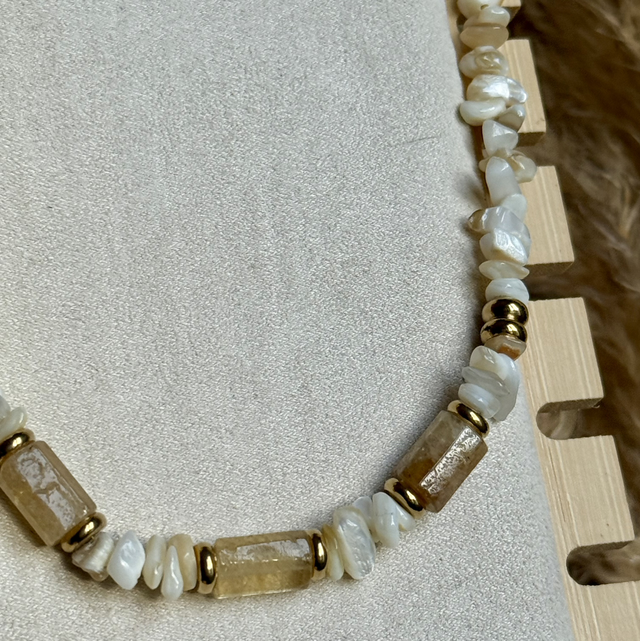 Collier en acier inoxydable, coquillage et pierre citrine.